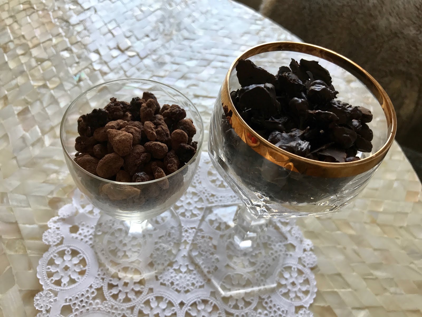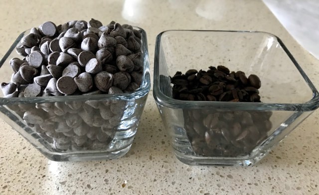 Step 1: Gather your supplies! I use a 2:1 ratio of dark chocolate to coffee beans. This photo is showing 1/2 cup of espresso beans and 1 cup of dark chocolate pieces.