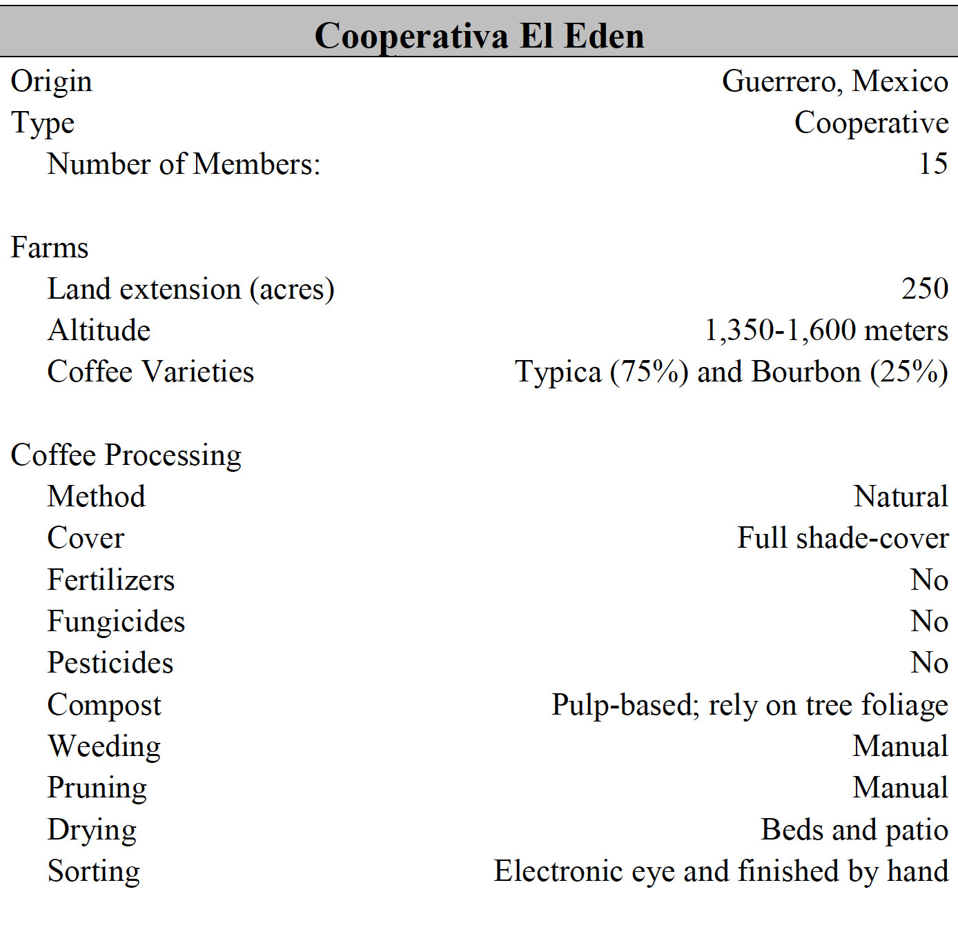 *The El Eden Cooperative partners with Tiger Orchid Coffee Company, a direct trade green coffee retailer, to ensure all co-op members receive continued education, resources, and a fair market price.