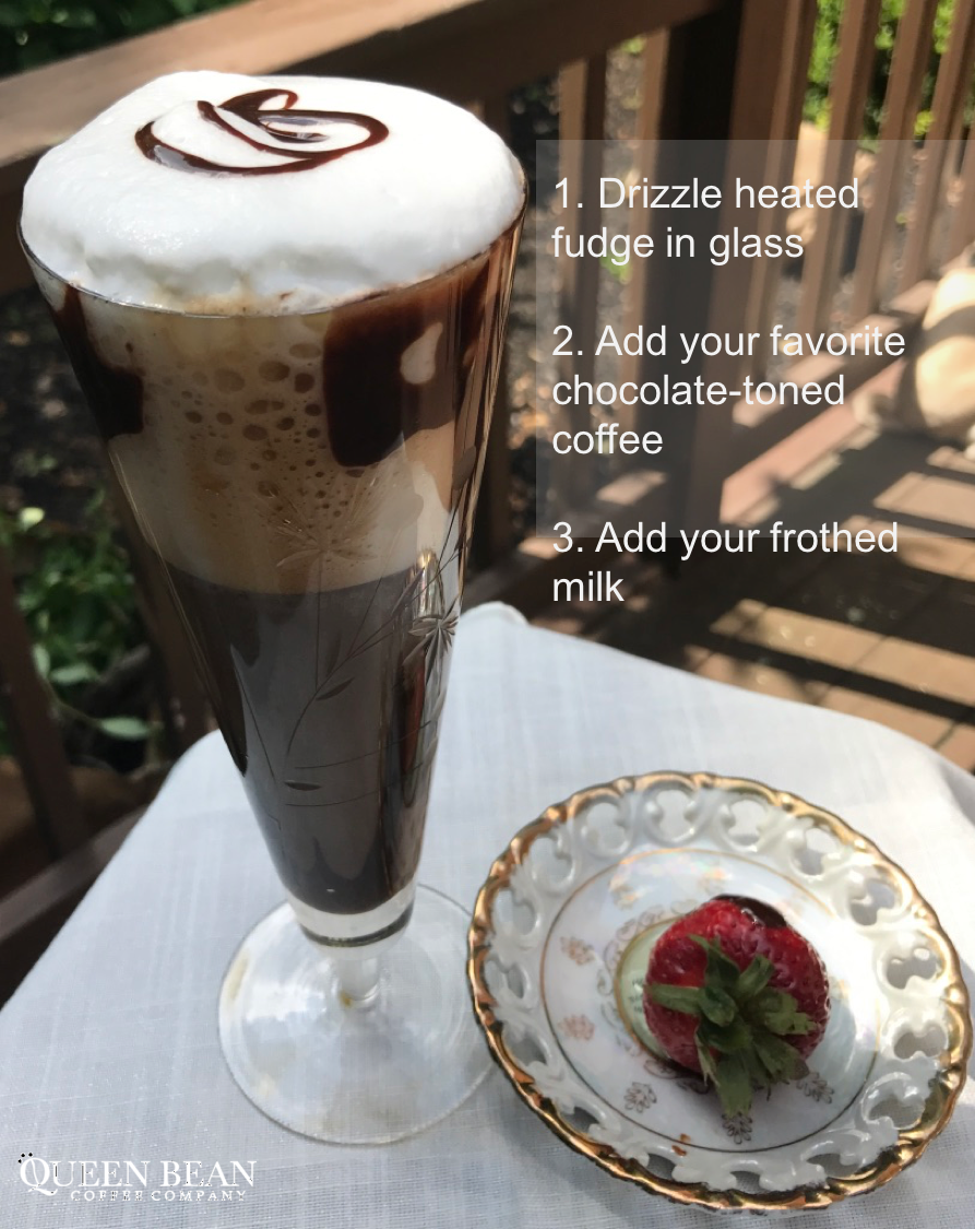 Step 5: Gently drizzle some of the remaining hot fudge onto your frothed milk.