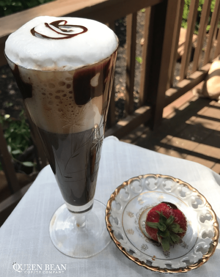 Step 2: Fill the glass 3/4th the way with a freshly brewed coffee. We suggest using a coffee with strong chocolate notes, such as Organic Peru Dark or Organically Grown Colombian Campesina.