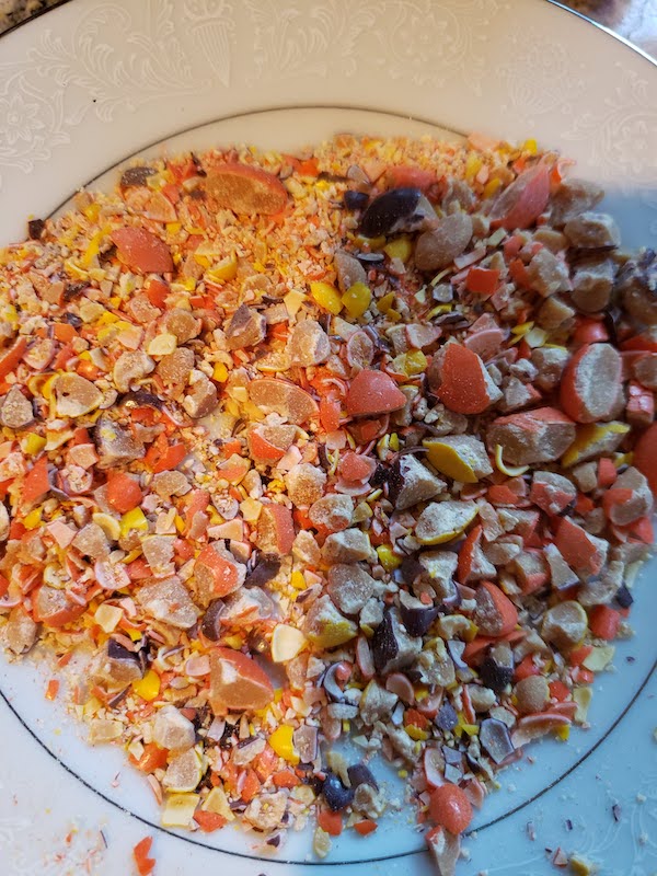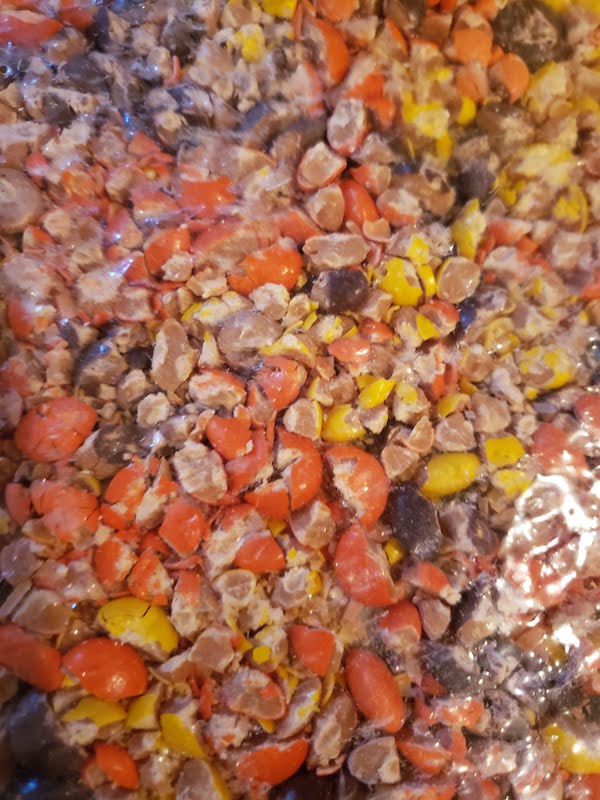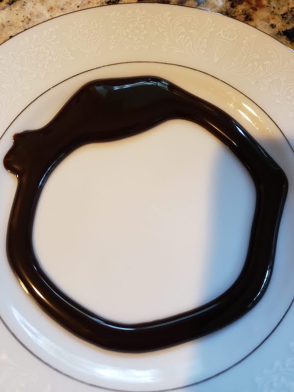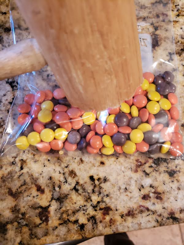 3.) Pour a circle of chocolate sauce on to one plate and your crushed Reese’s pieces onto another.