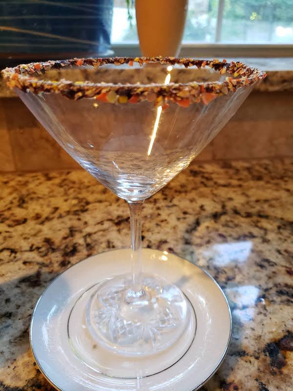 4.) Gently roll the rim of your glass over the chocolate sauce and then over the crushed pieces. Turn your glass upright.