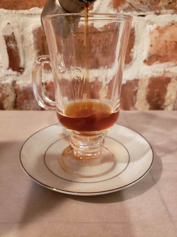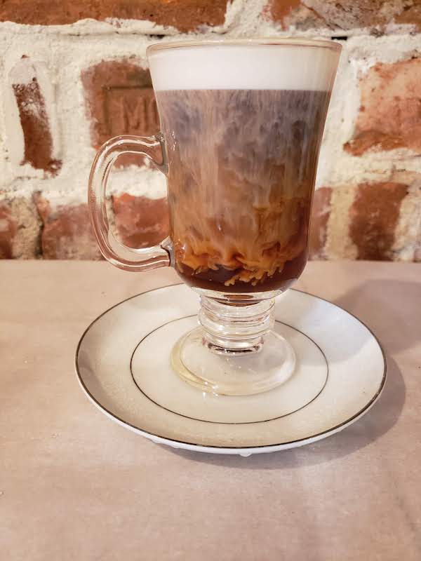 3.) Steam the milk and use a spoon to hold back the froth as you pour it into your coffee filled mug.