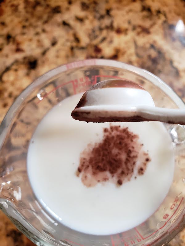 - 1/4 cup of dark chocolate milk (combine 6 ounces of milk with 1 & 1/2 teaspoons of dark chocolate cocoa powder and 1 teaspoon of powdered sugar.)