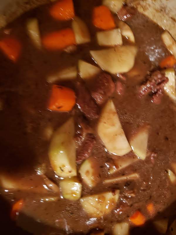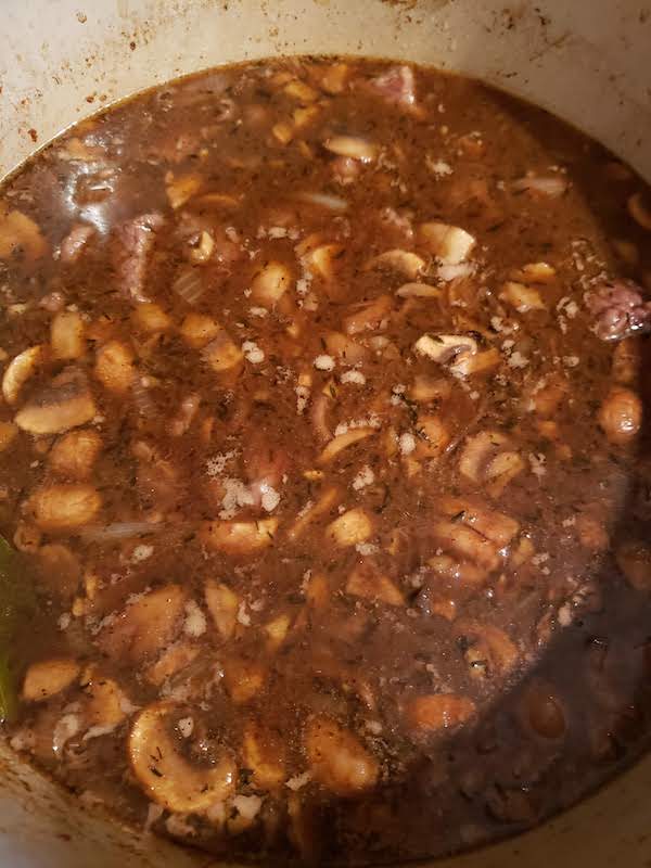2.) Reduce the heat to medium and add the remaining oil to the dutch oven. Include the garlic, onions, salt, pepper, thyme, bay leaf, mustard, and mushrooms. Cook until the onions are translucent, stirring frequently. Stir in the remaining flour. Gradually, add in the liquid (soup, coffee, Worcestershire, and wine) and beef. Heat until the stew begins to boil. Reduce the heat to low, cover, and allow the stew to simmer for 2 hours.