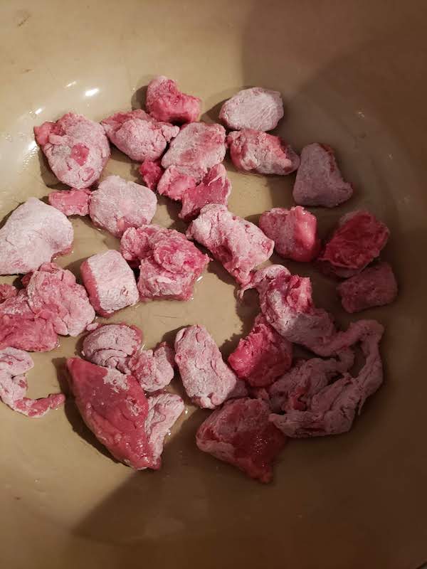 1.) Coat your beef cubes in flour. Add 2 tablespoons of oil to a Dutch oven. Incrementally add small amounts of beef to the pan. Cook on medium/high heat until brown, removing the browned meat as you go.