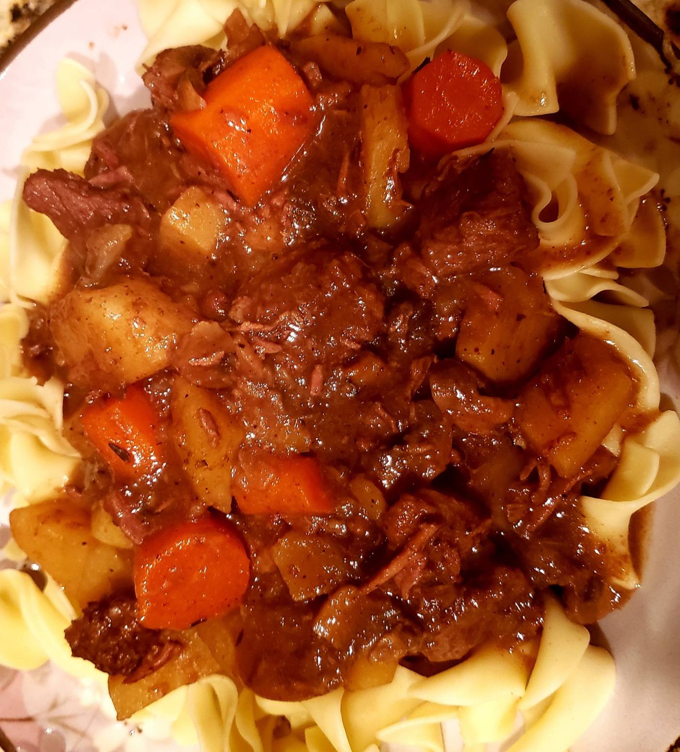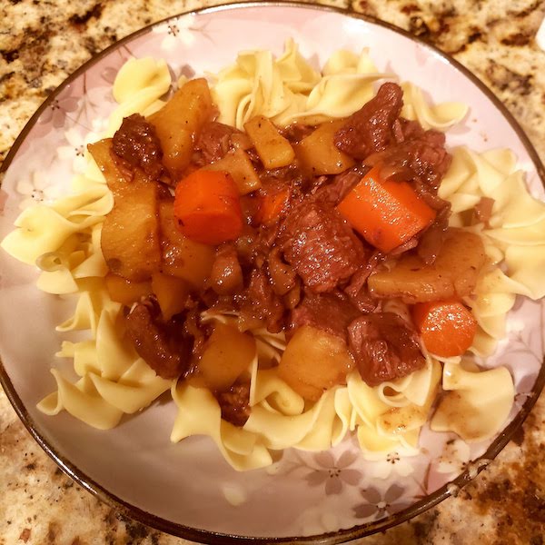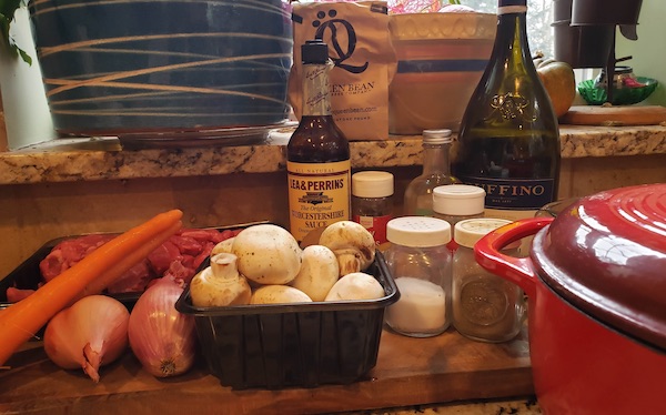 - 2 & 1/2 pounds of beef — stew meat or chuck cut into approximate 1-inch cubes