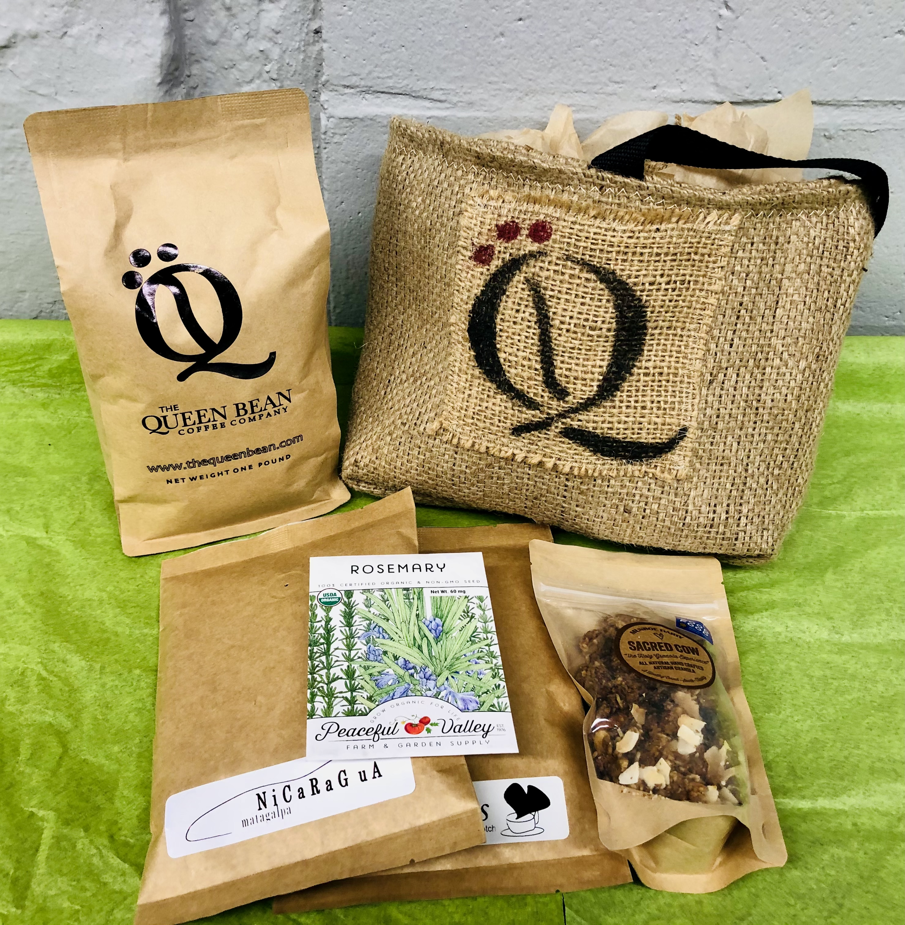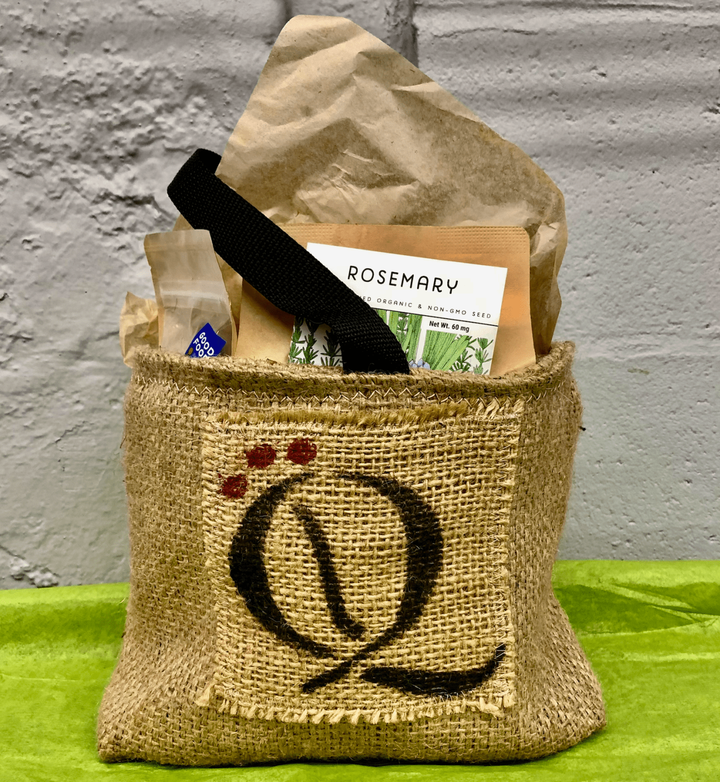 Our Eco Bag is an upcycled coffee sack that has been masterfully reconstructed into a durable single-strap mini-tote. Each Eco Bag contains three bags of our RI-roasted, organically-grown coffees, a bag of RI-made natural granola, a package of organic US herb seeds, and instructions on how to transform this sturdy, stylish bag into an environmentally-friendly planter. Burlap is a natural, sturdy, porous material that herbs, plants, and flowers love. For more on how to use burlap in your garden, stay tuned, we’ll be sharing our secrets later this spring. To learn more about the Eco Bag, click here.