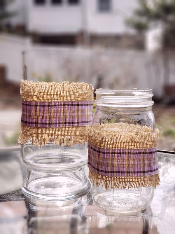 4.) Tightly wrap the border around your jar or vase, and glue the edges together. A tight wrap will stop it from slipping.