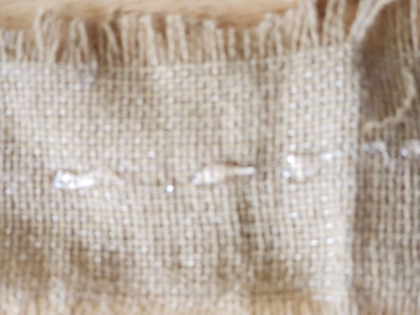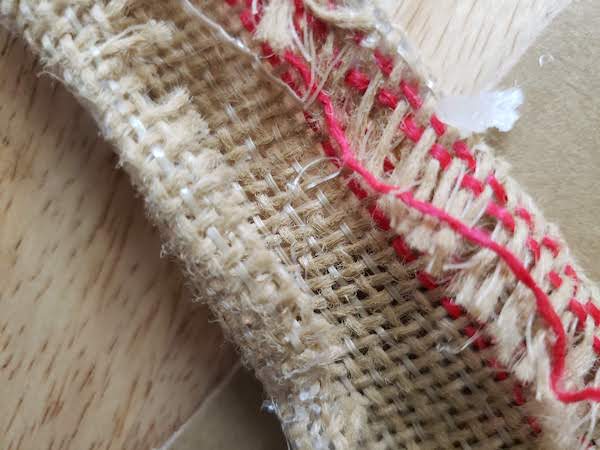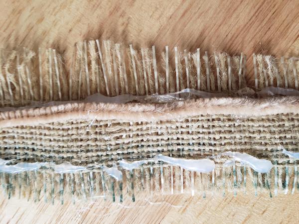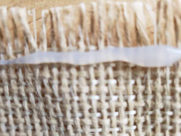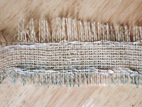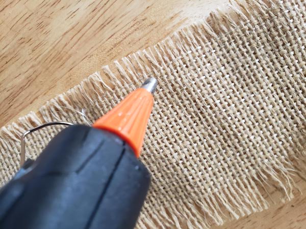 2.) If you want an even edge, run a line of glue along the length of the burlap strip and fold the end over. Press firmly and allow to dry. If you want to retain a frayed edge, run a line of hot glue directly where the fray begins. This will stop it from unraveling further.
