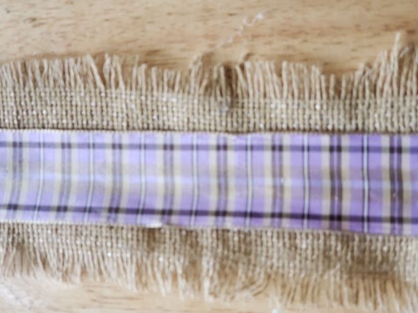 3.) Add your decoration of choice! For this design, I chose a gingham ribbon, but some lace or a bow would be equally as lovely. Center your ribbon on the burlap border and use a hot glue gun to affix it. Allow at least a minute for your design to dry. Check along the edges of your burlap and trim off any uneven bits.