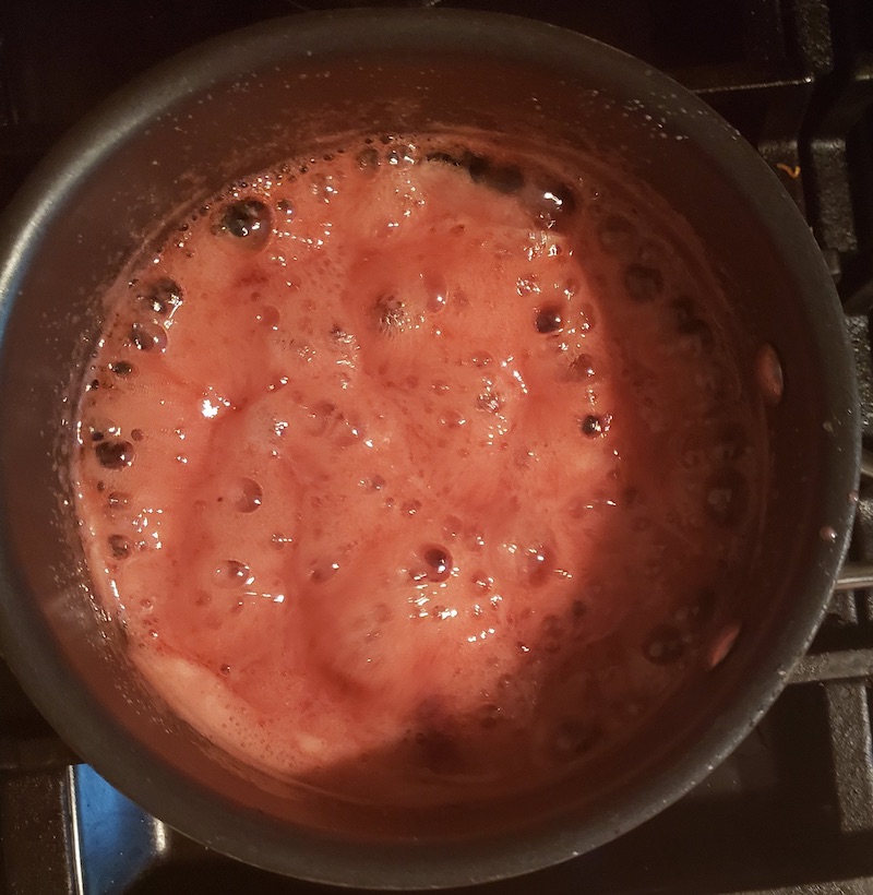 In a small saucepan combine 1/2 cup each, water, and sugar. Cook on medium heat stirring constantly until the sugar is dissolved. The solution should appear clear, not “foggy”. Chop 1/2 cup fruit into small pieces. Mix your fruit into the water mixture and bring the contents to a boil. Allow it to come to a low boil, and then reduce the heat to low, and simmer until the sauce thickens (an additional 10-15 minutes). Stir constantly as you may need to adjust the time depending on the desired thickness of your syrup. Allow it to cool. Strain the syrup into an air-tight container and refrigerate for later use.