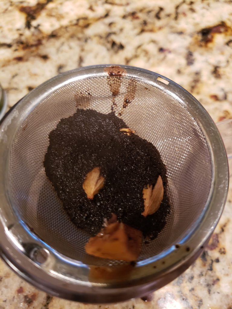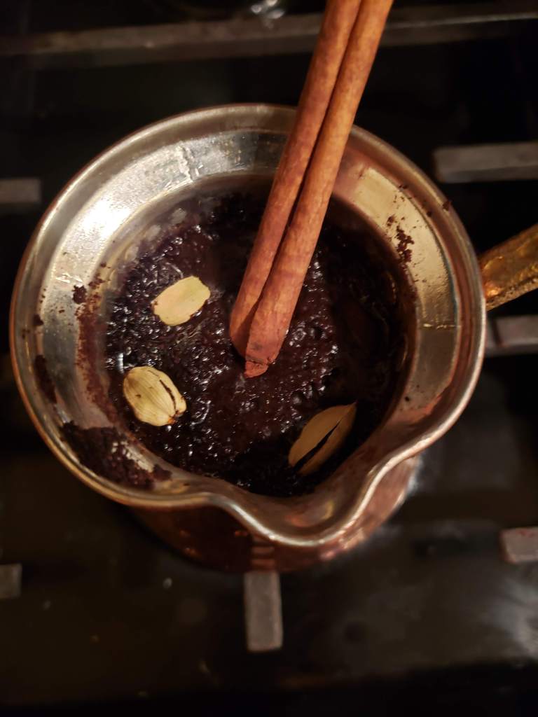 1.) Combine 2 tablespoons of finely ground coffee with 8 ounces of cold water into a saucepan (5 ounces if brewing in a Turkish coffee pot). Add 5 bruised cardamom pods, a strip of lemon peel, 2 cloves and a cinnamon stick. Bring the mixture just to the point of boiling. Strain the liquid and set it aside to cool.