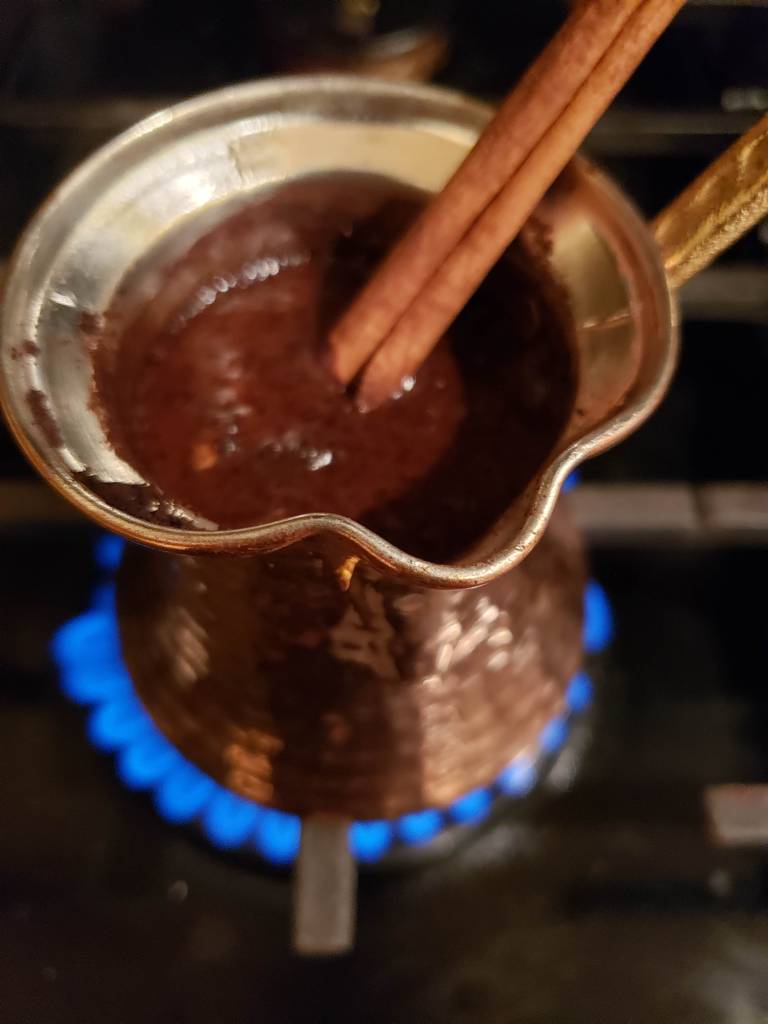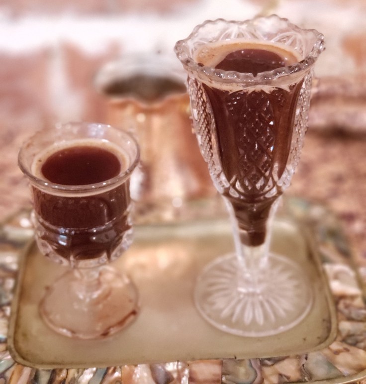 Turkish coffee arrived in Istanbul in the 16th century via Yemen, when an Ottoman governor could not resist its velvety deliciousness. It is usually brewed in a cezve – a small long handled pot, typically made of copper or brass – and consists of coffee ground to a fine powder combined with water and spices. Brought just to the point of a slow careful boil, it is cooked unfiltered and served “grounds in the cup”. This rich velvety coffee may be called by a different name3, and contain different spices1 depending on the nationality of the preparer. If you love a rich, strong, concentrated, and caffeinated brew this is the coffee preparation for you! Below are directions for preparing a Turkish style coffee followed by a wonderful Turkish coffee cocktail recipe for those of you so inclined. Enjoy!