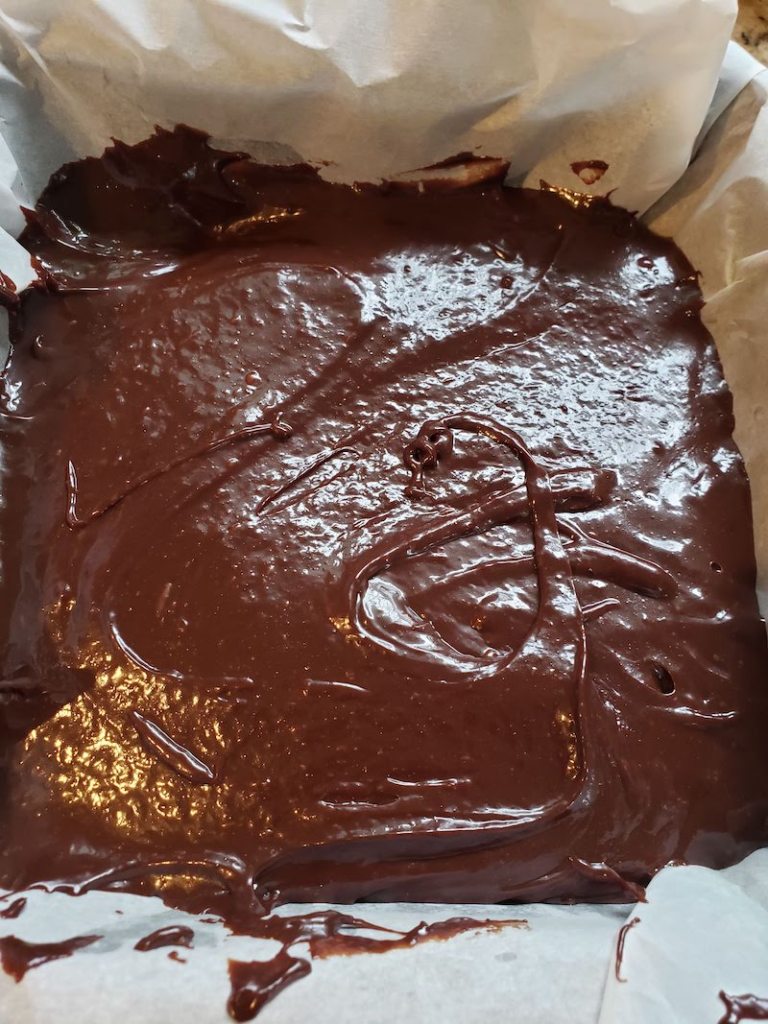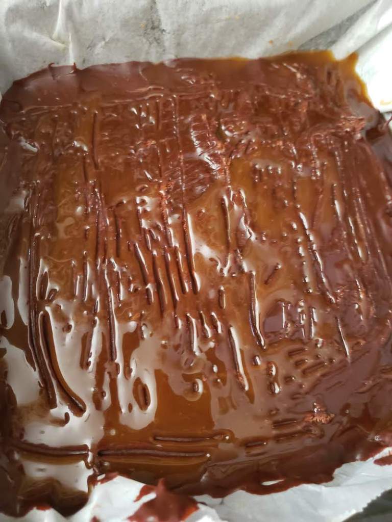 4.) Pour the mixture into the lined pan. Optionally, coat the top of your fudge with caramel sauce. Make indents with a fork so that the sauce can settle into the fudge.