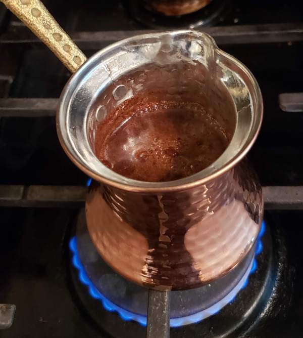 Turkish coffee arrived in Istanbul in the 16th century via Yemen, when an Ottoman governor could not resist its velvety deliciousness. It is usually brewed in a cezve - a small long handled pot, typically made of copper or brass - and consists of coffee ground to a fine powder combined with water and spices. Brought just to the point of a slow careful boil, it is cooked unfiltered and served "grounds in the cup". This rich velvety coffee may be called by a different name3, and contain different spices1 depending on the nationality of the preparer. If you love a rich, strong, concentrated, and caffeinated brew this is the coffee preparation for you! Below are directions for preparing a Turkish style coffee followed by a wonderful Turkish coffee cocktail recipe for those of you so inclined. Enjoy!